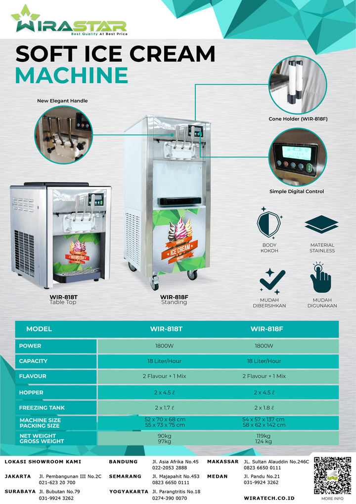 Seri WIR818 sendiri merupakan salah satu seri best seller dari Wiratech. Mesin ini laku terjual ratusan unit dalam sebulan, bukan karena harganya saja yang terjangkau, tetappi spesifikasi yang di usung juga semakin modern dan canggih. Beragam fitur dan teknologi terbaru ikut di benamkan seperti: Puffing System, Digital panel Instrument,Counter Indicator, Voltage Indicator dan Fitur Self Cleaning yang sangat penting.