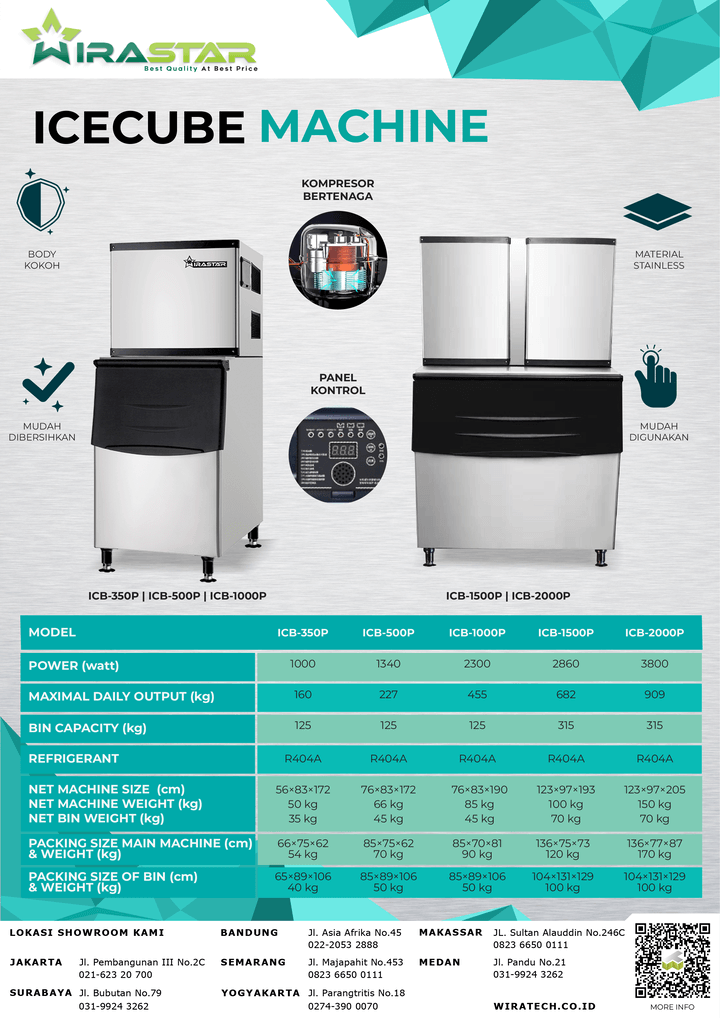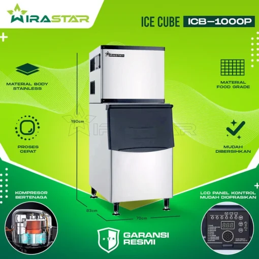 - Material Unggul: ICB-1000P dibuat dengan menggunakan material yang tahan lama dan higienis, menjaga mutu es batu yang dihasilkan tetap bersih dan aman untuk konsumsi.